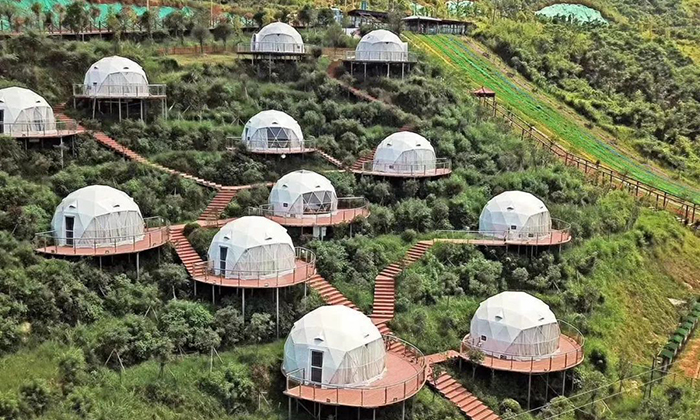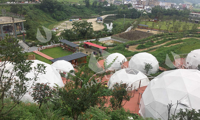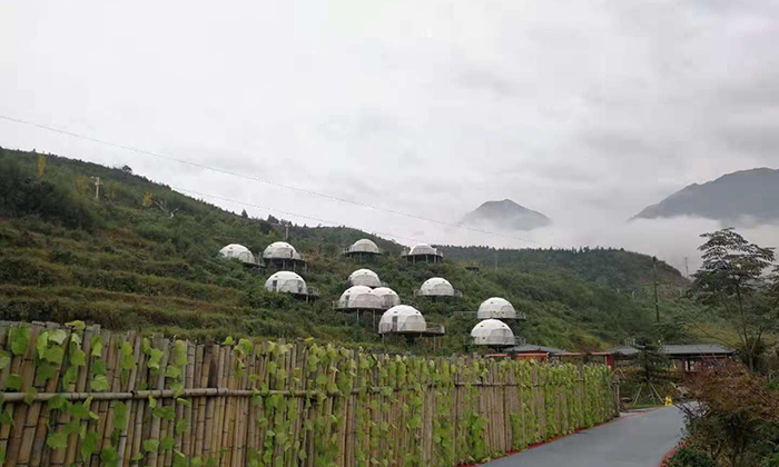 球形星空酒店帳篷一直受到游客的喜愛,這一次武功山的營地也是搭建球形星空酒店帳篷。在這里綠油油的風景中,最合適搭建酒店帳篷。遠遠看去12頂白色球形星空帳篷在綠景也能成為一道亮麗的風景。