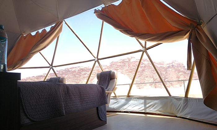 從設計外觀看球形帳篷。采用了三角形網架的設計架構搭配高強度的管材,塑造