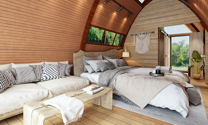 這款產品是天幕小屋家庭款,產品戶型是標準間,外部面積:72 ㎡,內部面積:38 ㎡,外部尺寸:8*9 m ,內部尺寸: 4.5*8.5m,主體高度:3.7 m ,墻面高度:2.2 m,防風等級:8 級。
