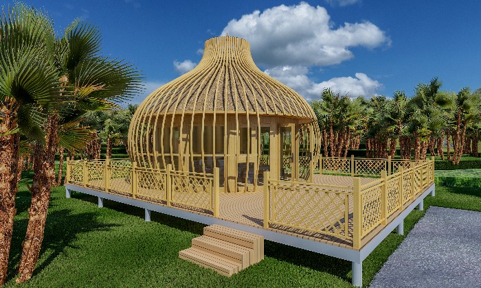 設計理念源于“鳥籠”結構整齊大氣的布局令人歸隱山林,敞開心扉,歸隱山林,具有開放式的玲瓏造型,賦予了它獨特的真實感和具有震撼力的形體,外觀即為建筑的結構,立面與結構達到了高度的統一。室內設有臥室和洗漱間,