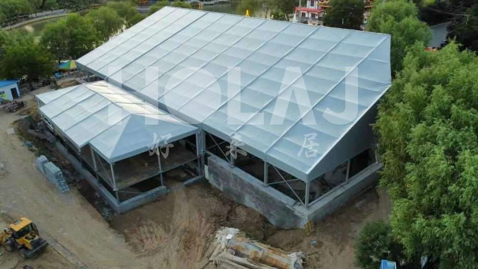 好來居篷房采用坡屋面鋁合金篷房結構形式搭建了40*55*3.3異形主體篷房和10*25*3.3入口門廊,對考古現場進行覆蓋保護。建筑形式為裝配式人字頂篷房,由若干鋁合金管材和鋼結構節點板拼接成骨架,外面罩以膜材形成。